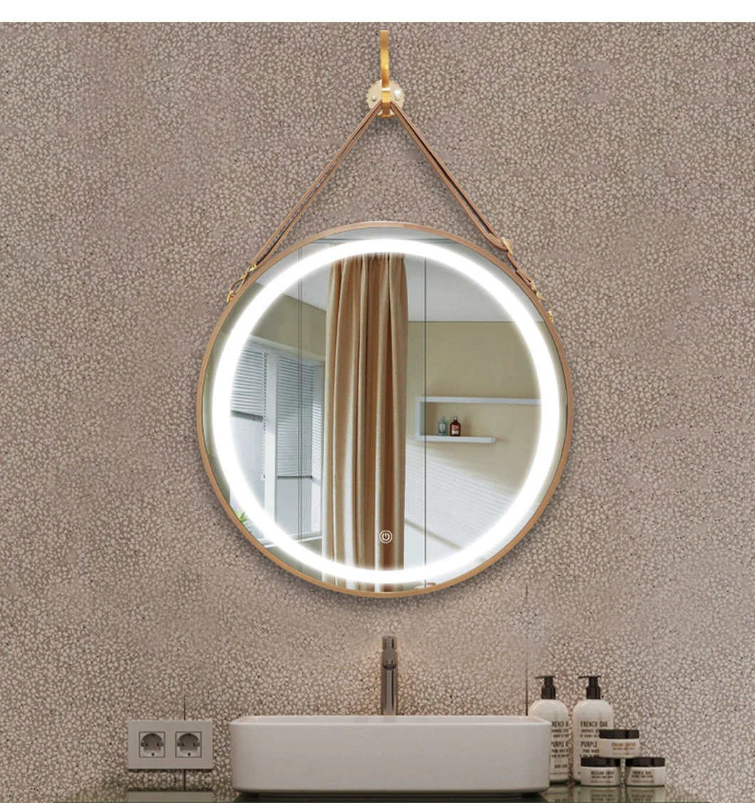 Acasă / Produs / Oglinda pentru baie / Oglindă rotundă LED pentru baie de perete cu curea din piele Oglindă inteligentă Oglindă de perete Decorare acasă Oglindă de machiaj Bluetooth Accesorii pentru baie Mobilier de salon